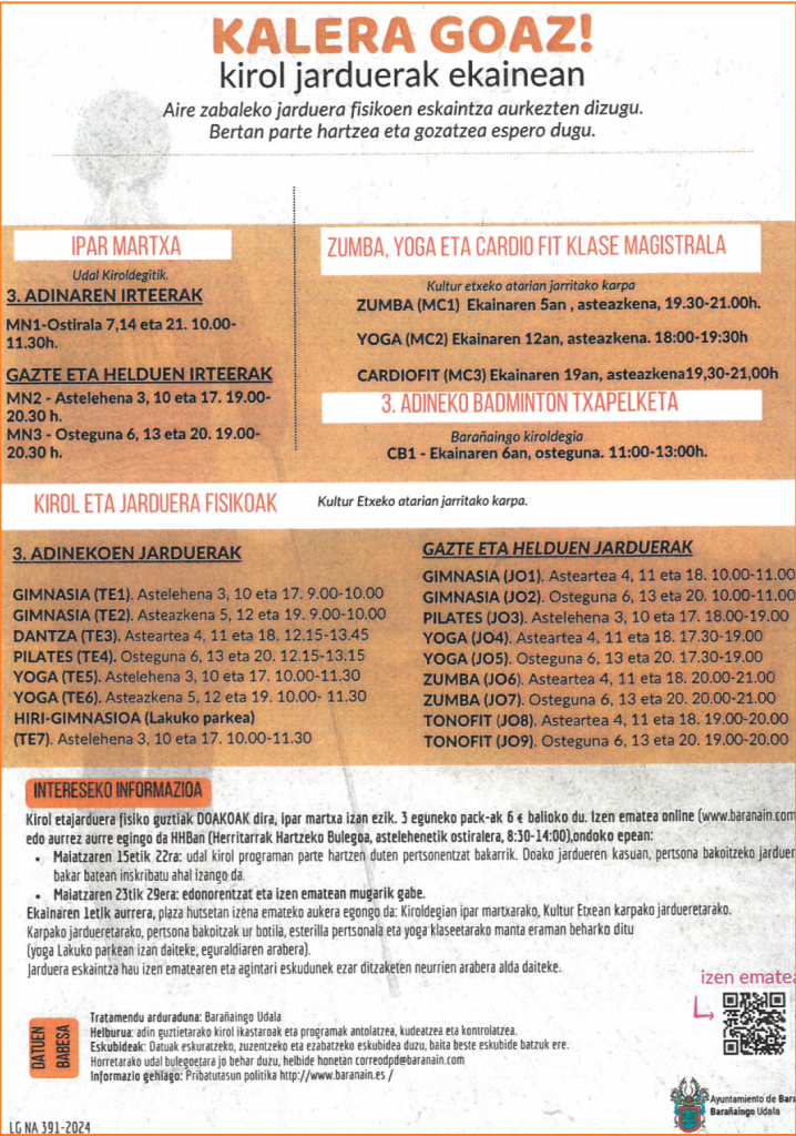 Kalean egiteko kirol-jarduera fisikoen eskaintza aurkezten dizugu. Bertan parte hartzea eta gozatzea espero dugu.