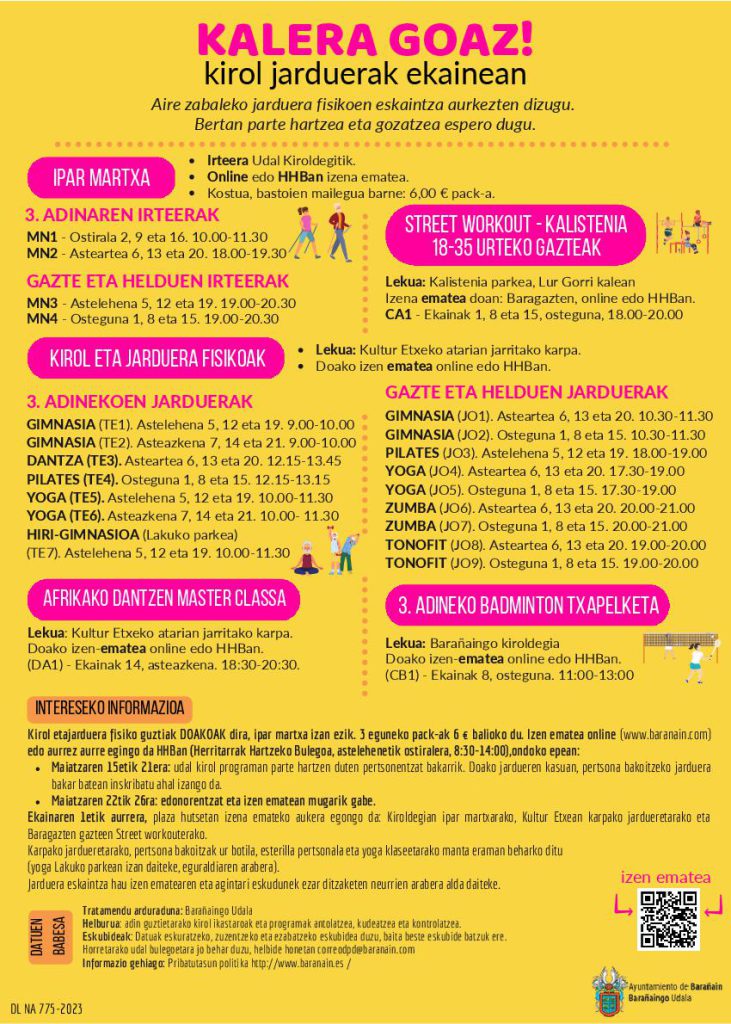 Kalean egiteko kirol-jarduera fisikoen eskaintza aurkezten dizugu. Bertan parte hartzea eta gozatzea espero dugu.