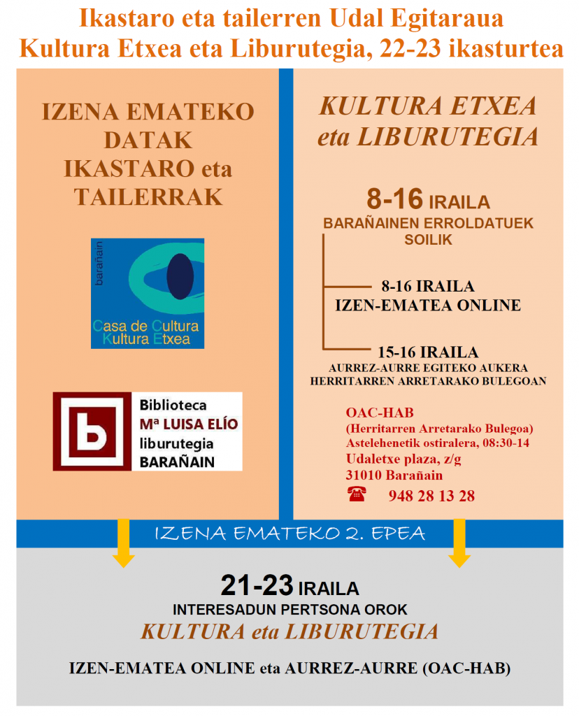 Izena eman aurreko erregistroa posta elektronikoarekin egin dezakezue jada, “Flyer-a – Izen-emateko ERA berria eta Egitaraua Kultura-Liburutegia ikastaroak 2022-23” pdf dokumentuan azaltzen den moduan. Nahiz eta oraindik ezin eman izena, ikastaroak ikus ditzakezue “Ikastaroak kontsultatu” aukeraren bidez.