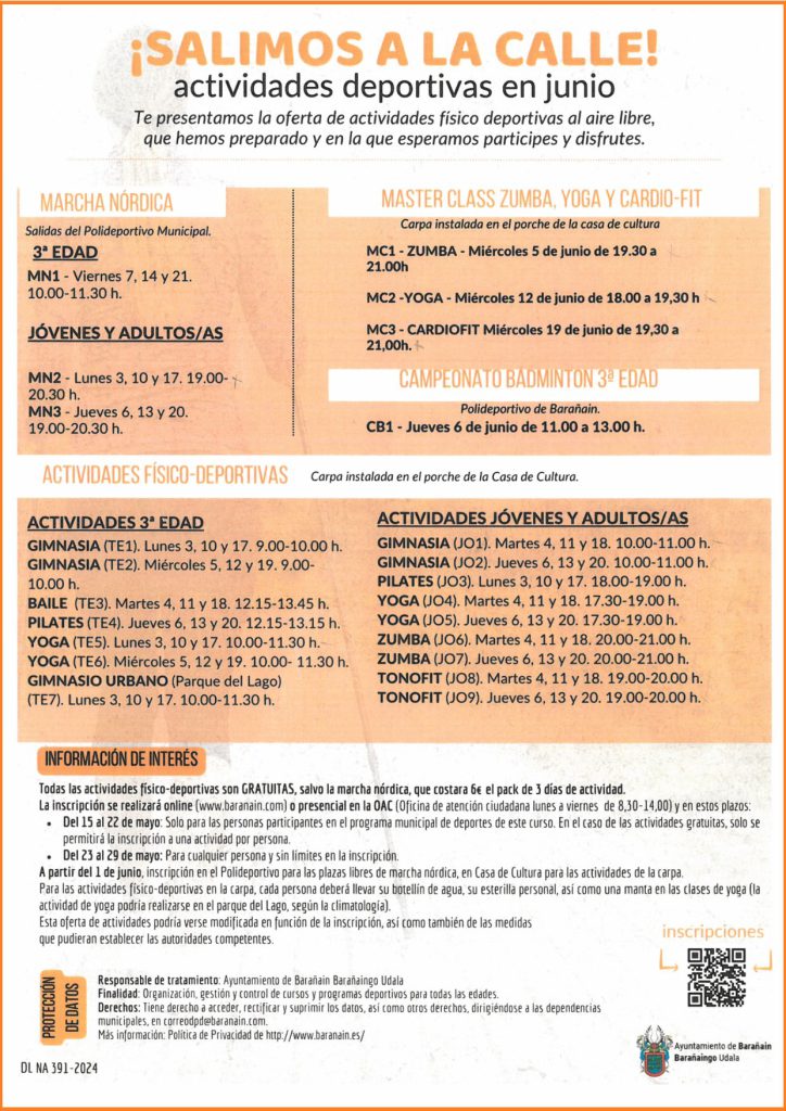 Del 15 al 22 de mayo: Sólo para las personas participantes en el programa municipal de deportes de este curso. En el caso de las actividades gratuitas, sólo se permitirá la inscripción a una actividad por persona.